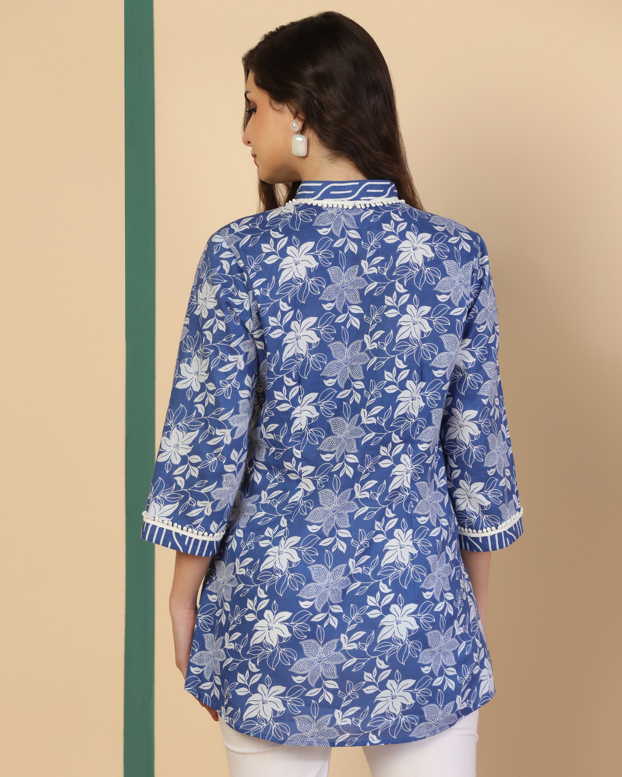 Stay stylish and comfortable with this women’s cotton printed top, designed in a kurti-inspired silhouette. Featuring a mandarin collar, contrast piping, and 3/4 sleeves, this top blends modern casual wear with ethnic charm. Crafted from breathable cotton, it is perfect for everyday use, office wear, or casual outings. Available in vibrant prints and multiple sizes, this top pairs effortlessly with jeans, trousers, or leggings.