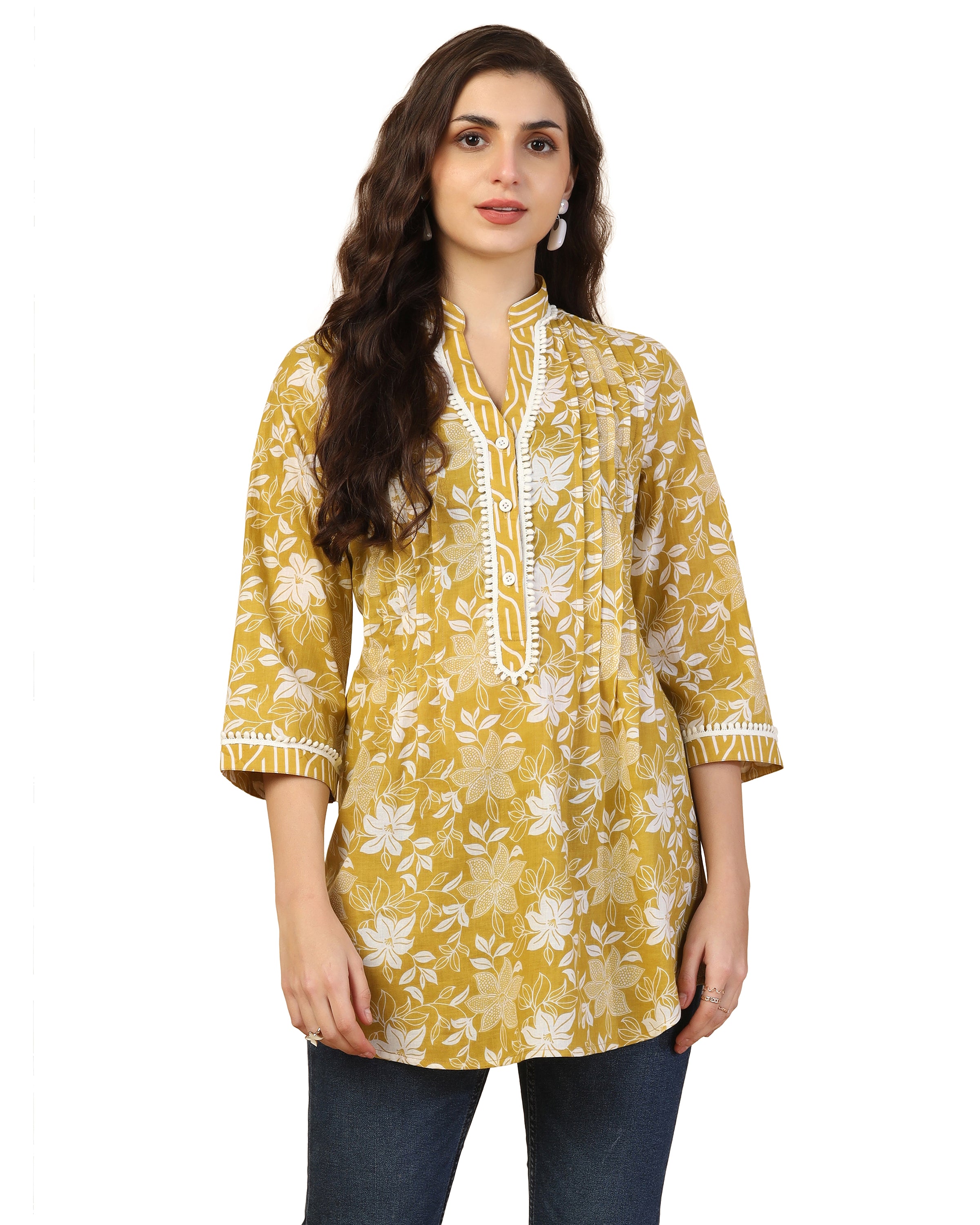 Elevate your everyday look with this women’s cotton printed top, styled in a kurti-inspired design. It features a mandarin collar, contrast piping, and 3/4 sleeves that bring together ethnic charm and modern casual style. Made from breathable cotton, it ensures all-day comfort, making it ideal for office, daily wear, or casual outings. Available in vibrant prints and multiple sizes, this versatile top pairs effortlessly with jeans, trousers, or leggings.