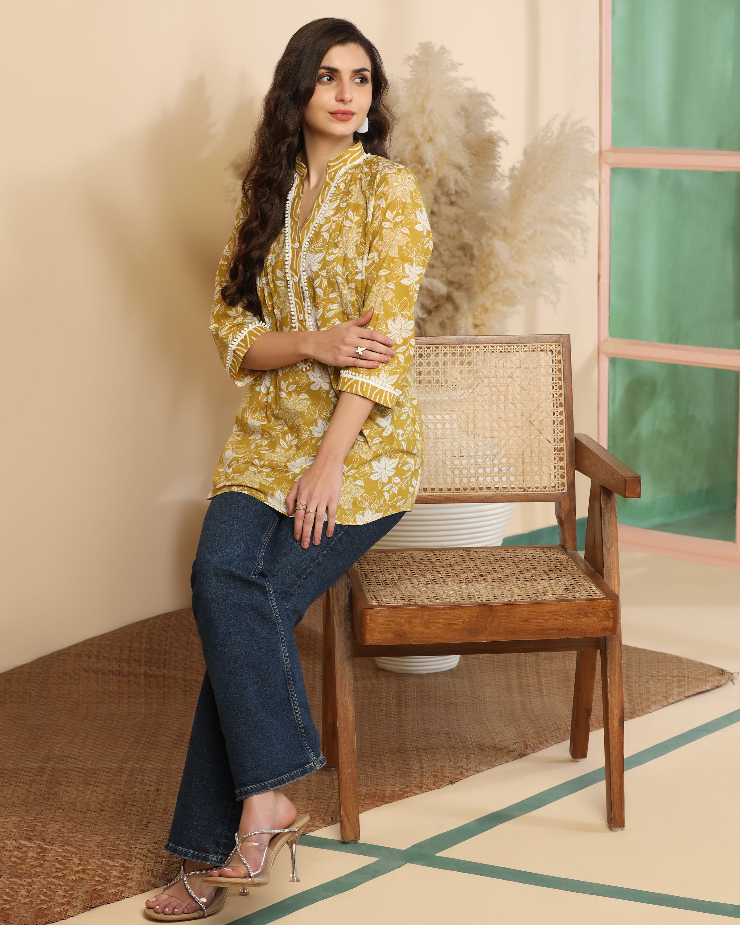 Stylish Design – Kurti-style top with mandarin collar and contrast detailing.