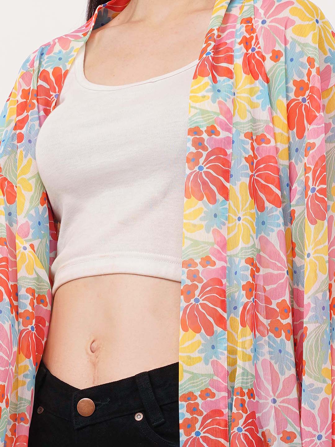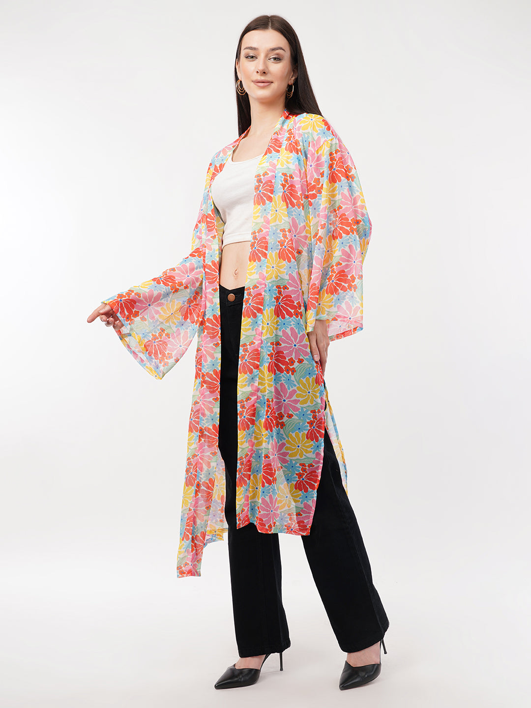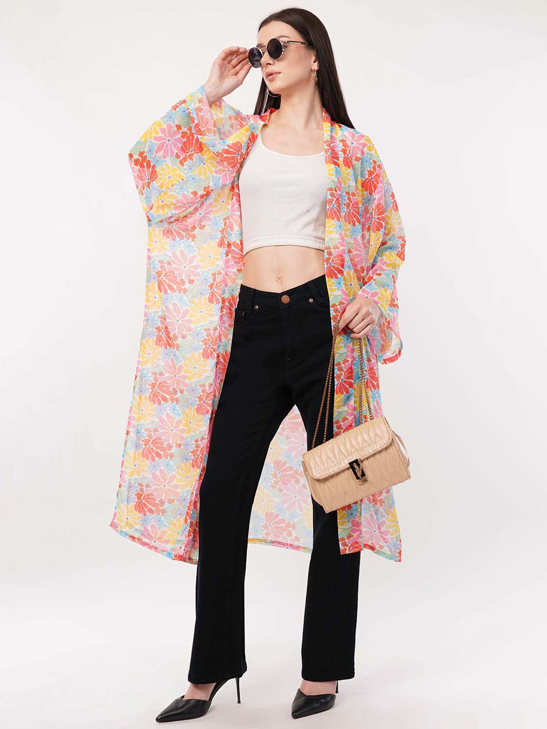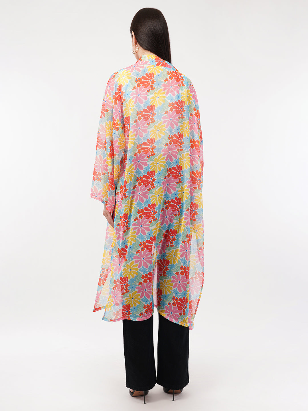 Pink and blue,yellow floral printed open front longline shrug ,has long sleeves, straight hem