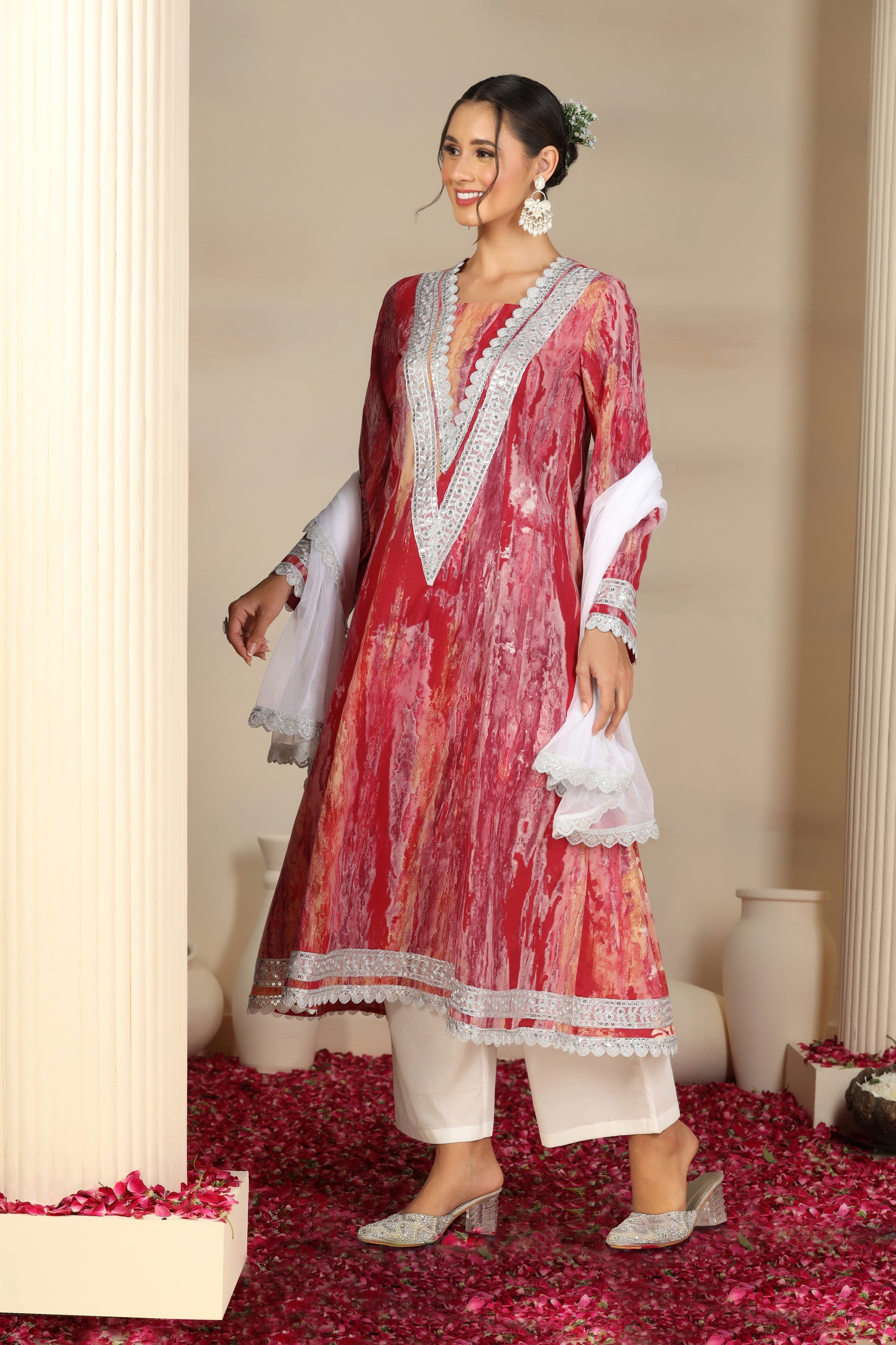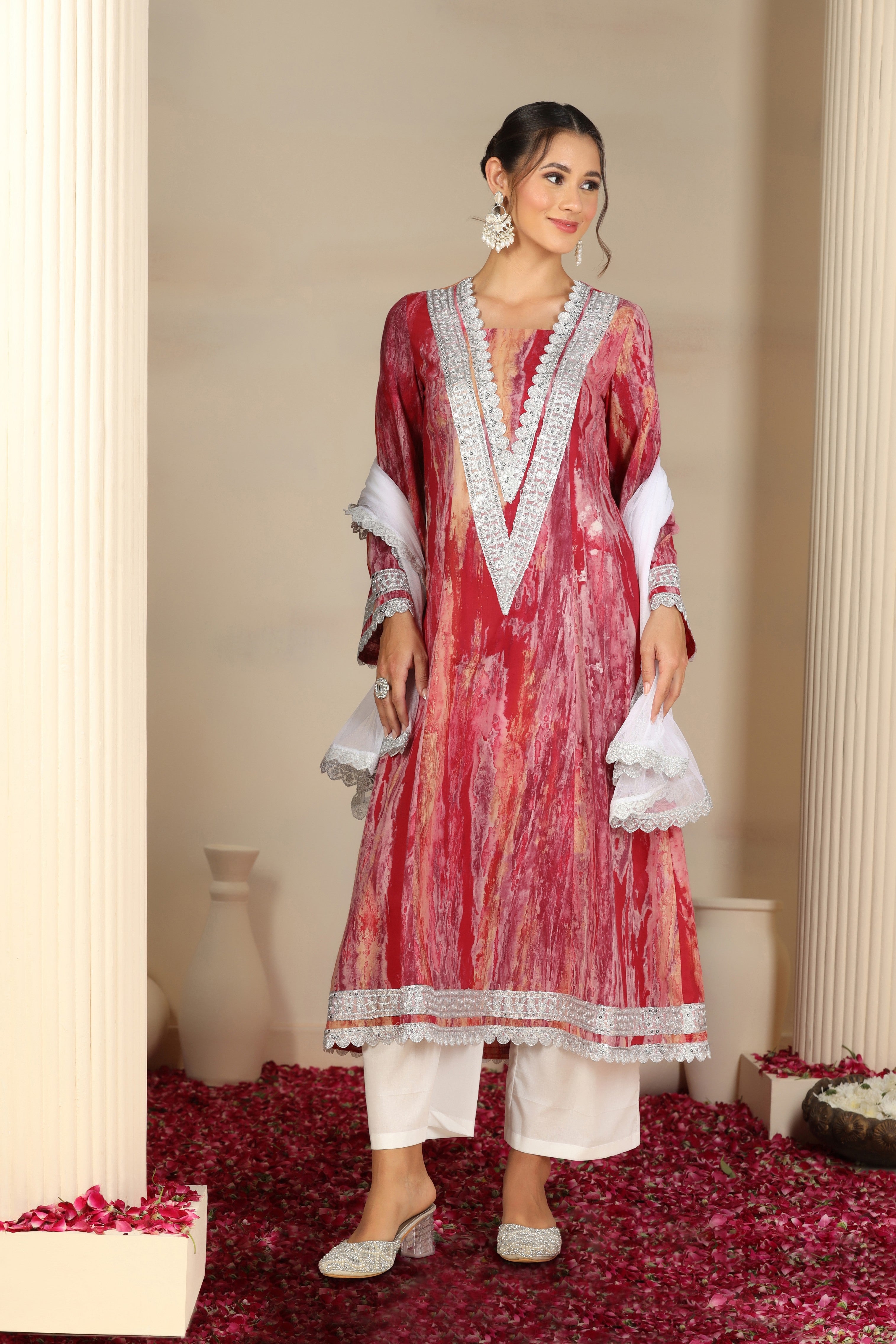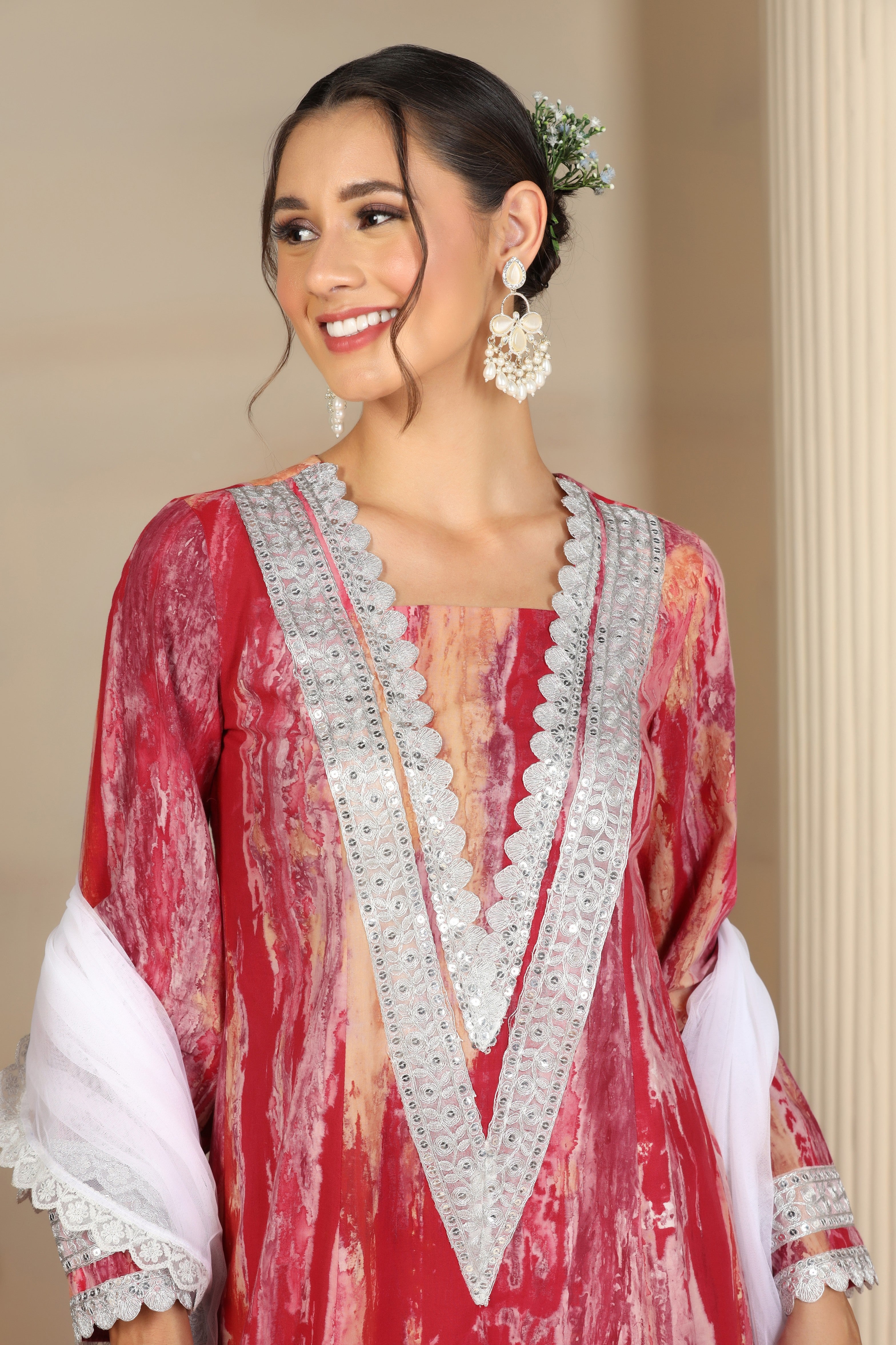 Step into timeless elegance with our exquisite Crimson Elegance Kurta Set, a perfect blend of sophistication and charm. Crafted in a stunning marbled red hue, this kurta features an eye-catching silver lace neckline and border detailing, adding a graceful shimmer to your festive wardrobe.