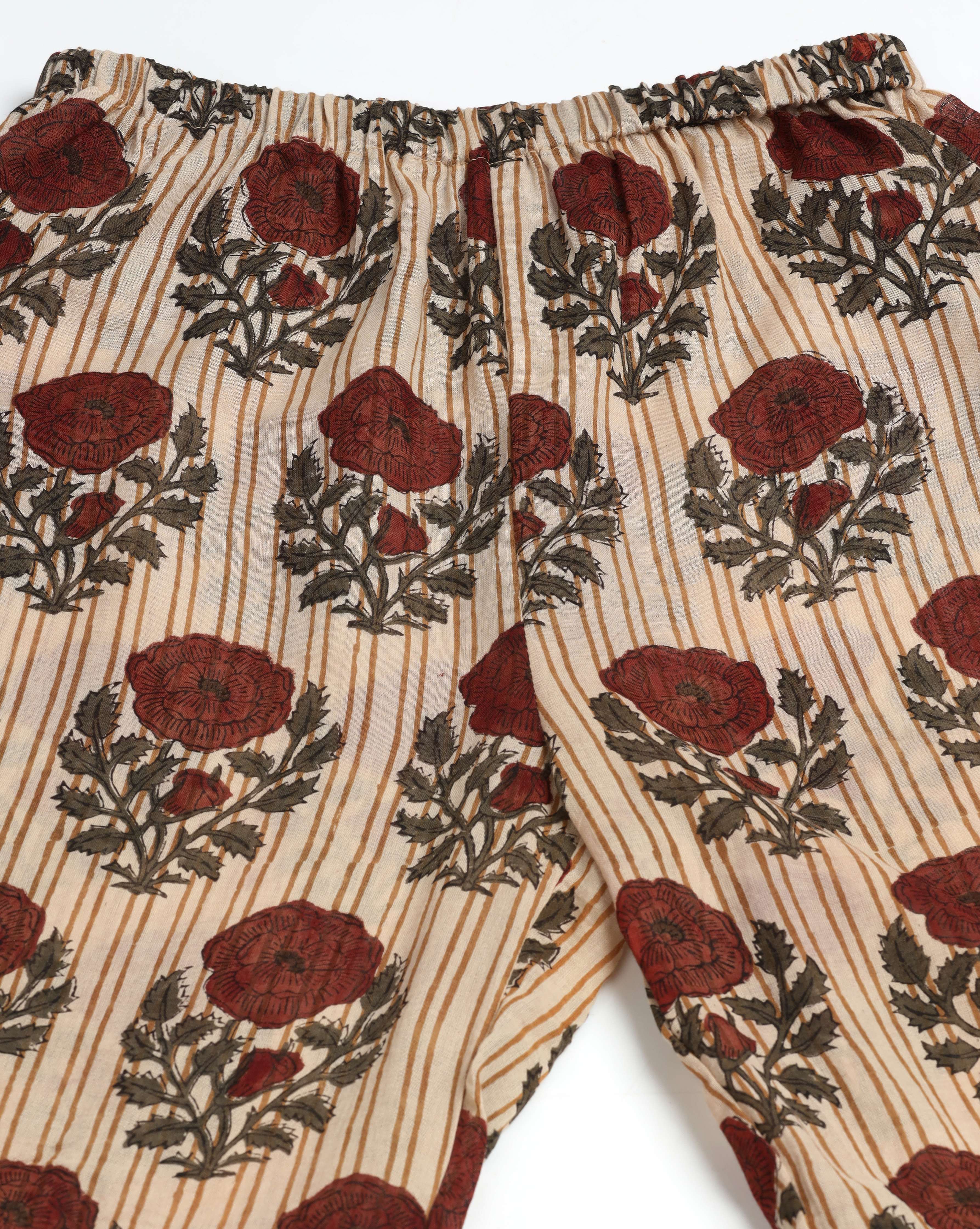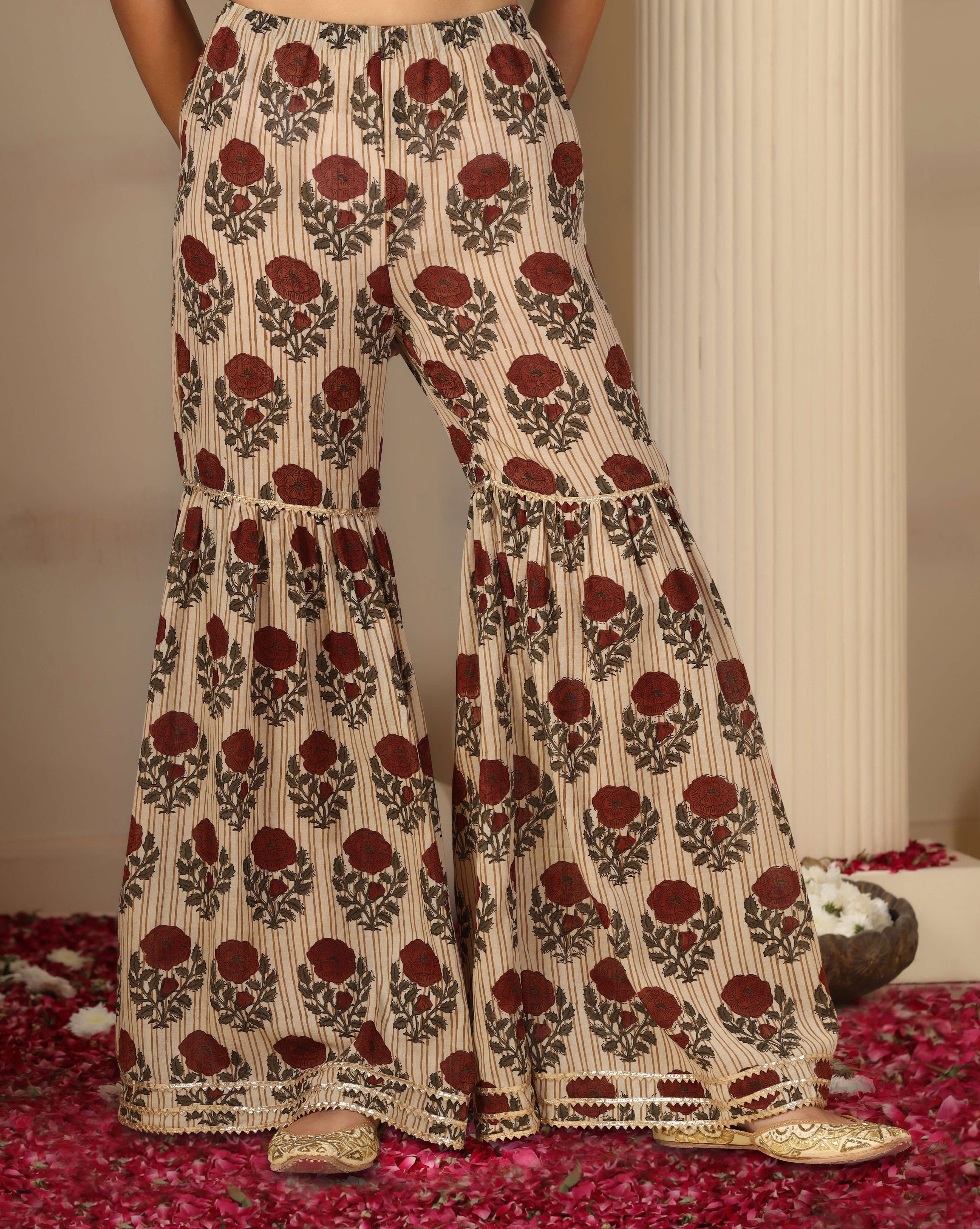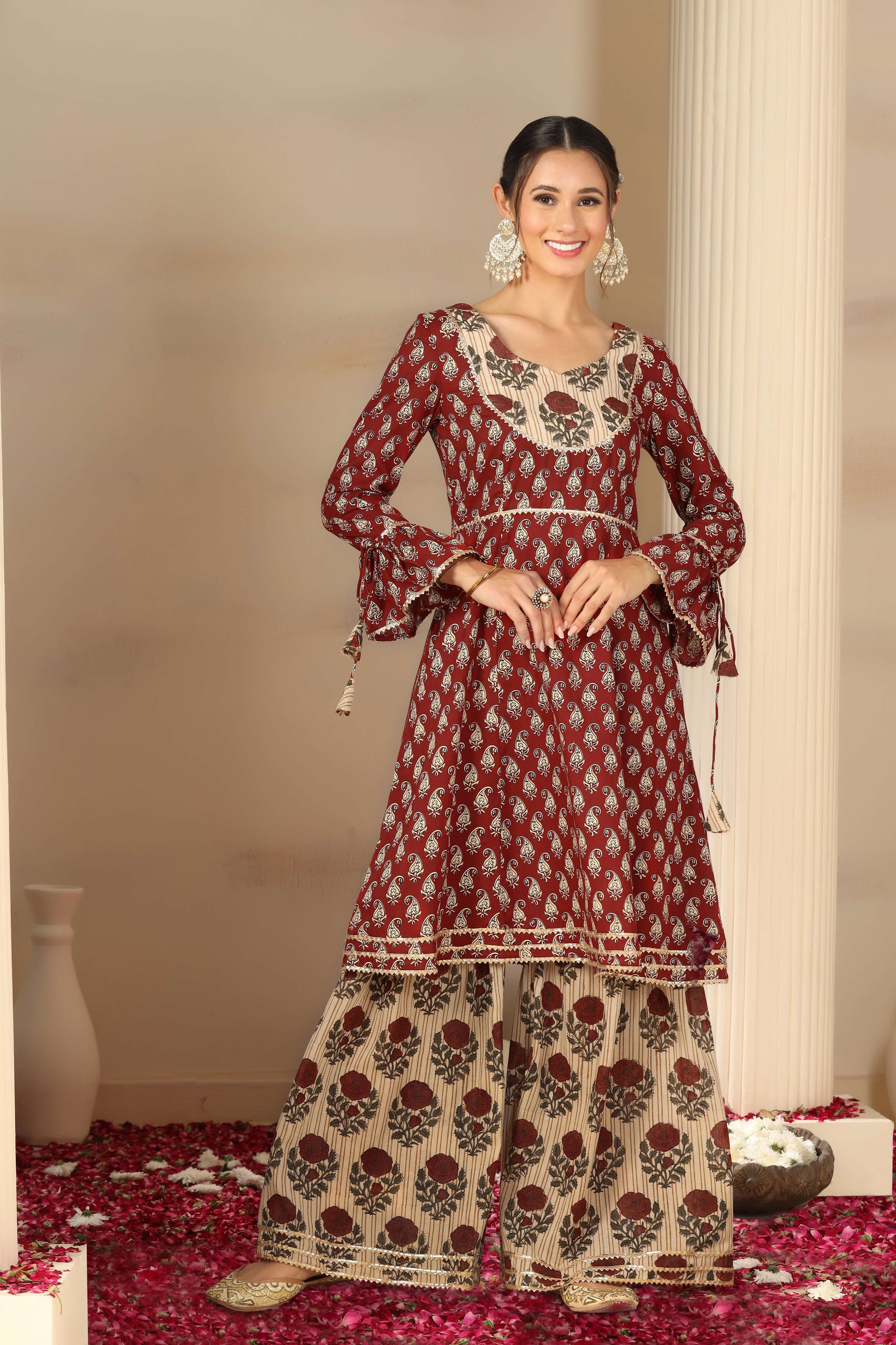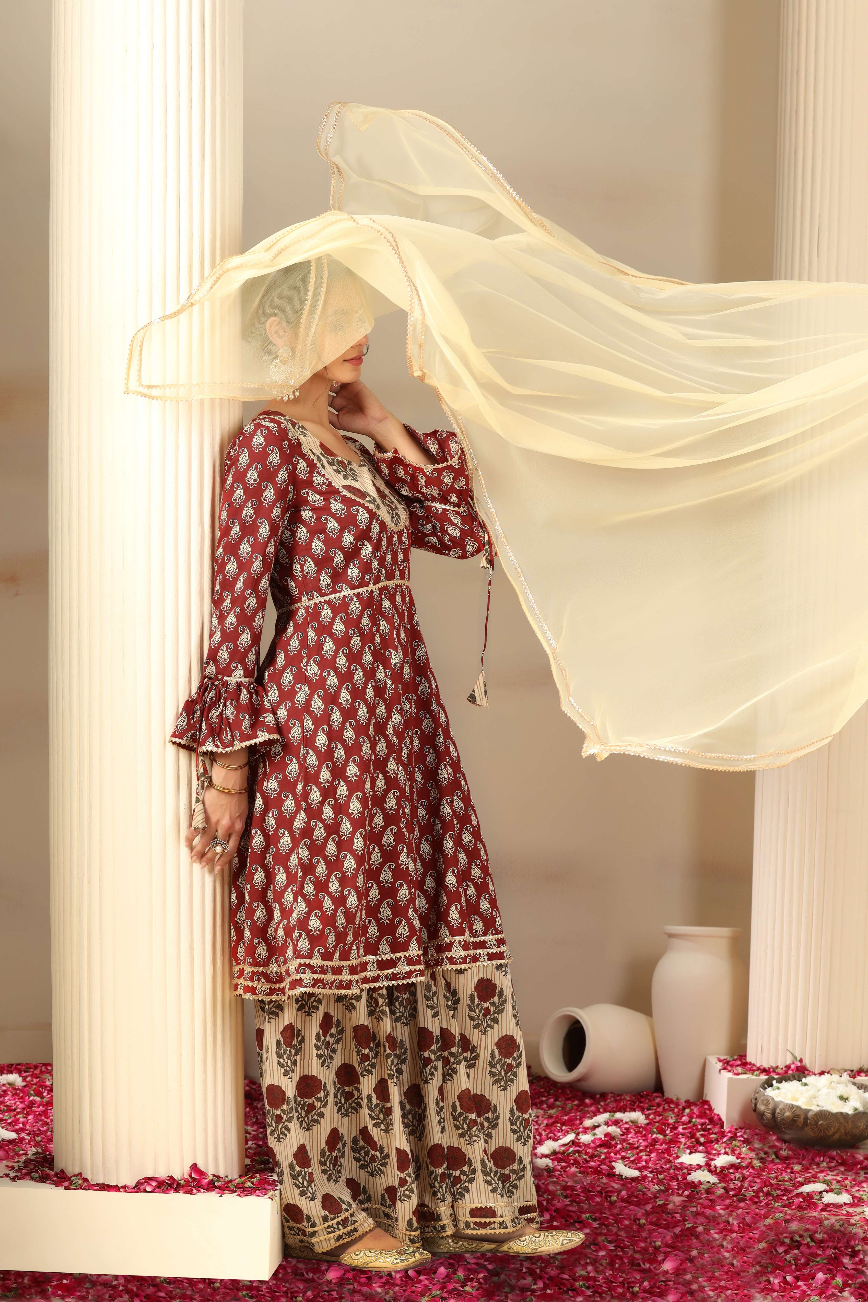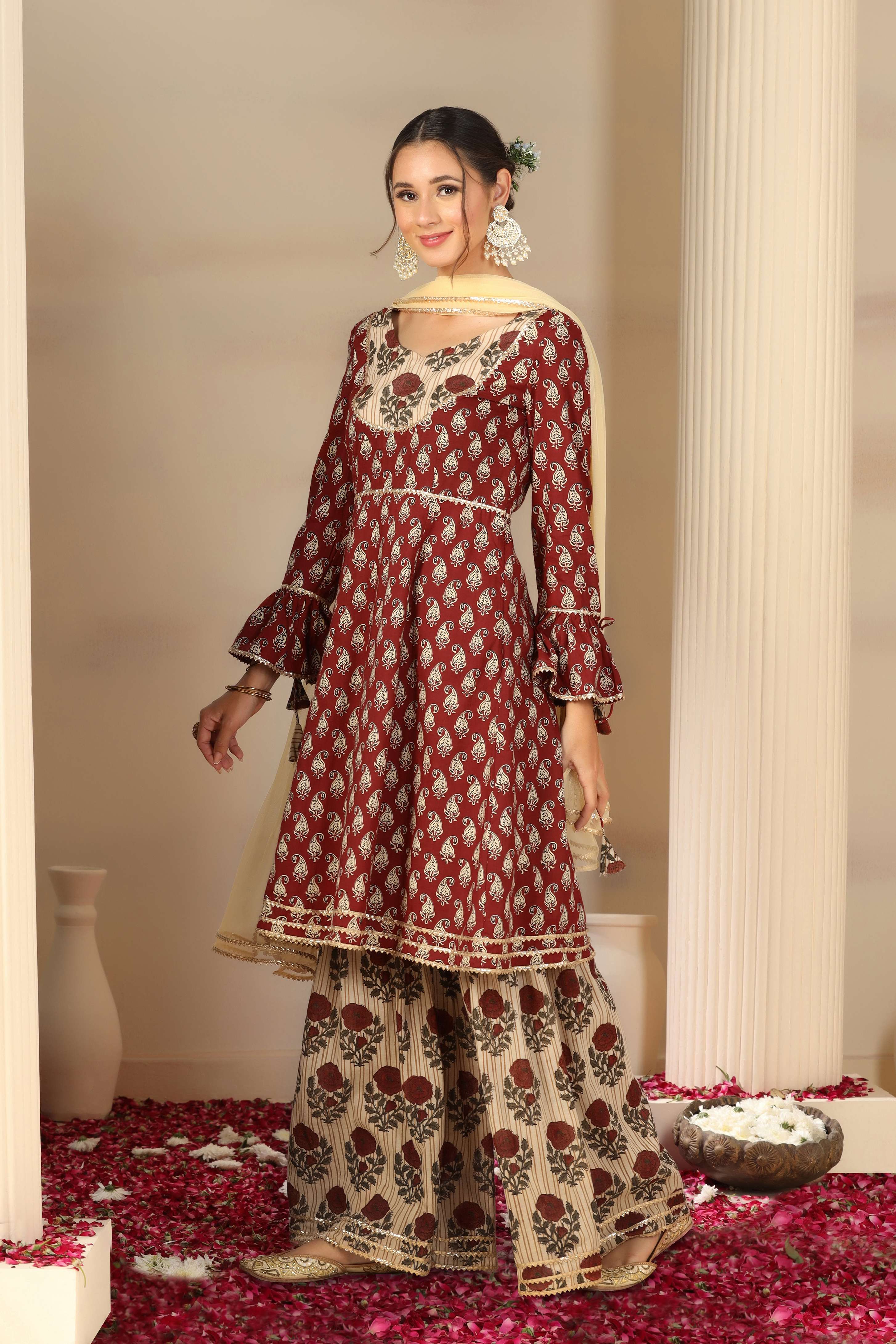 Bring elegance and comfort together with this women’s cotton kurta set, designed with a printed maroon kurta, contrasting beige palazzo pants, and a matching dupatta. The kurta features flared sleeves, delicate lace detailing, and a flattering fit that enhances your ethnic charm. Crafted in breathable cotton fabric, this set is ideal for festive occasions, family gatherings, weddings, or casual traditional outings.