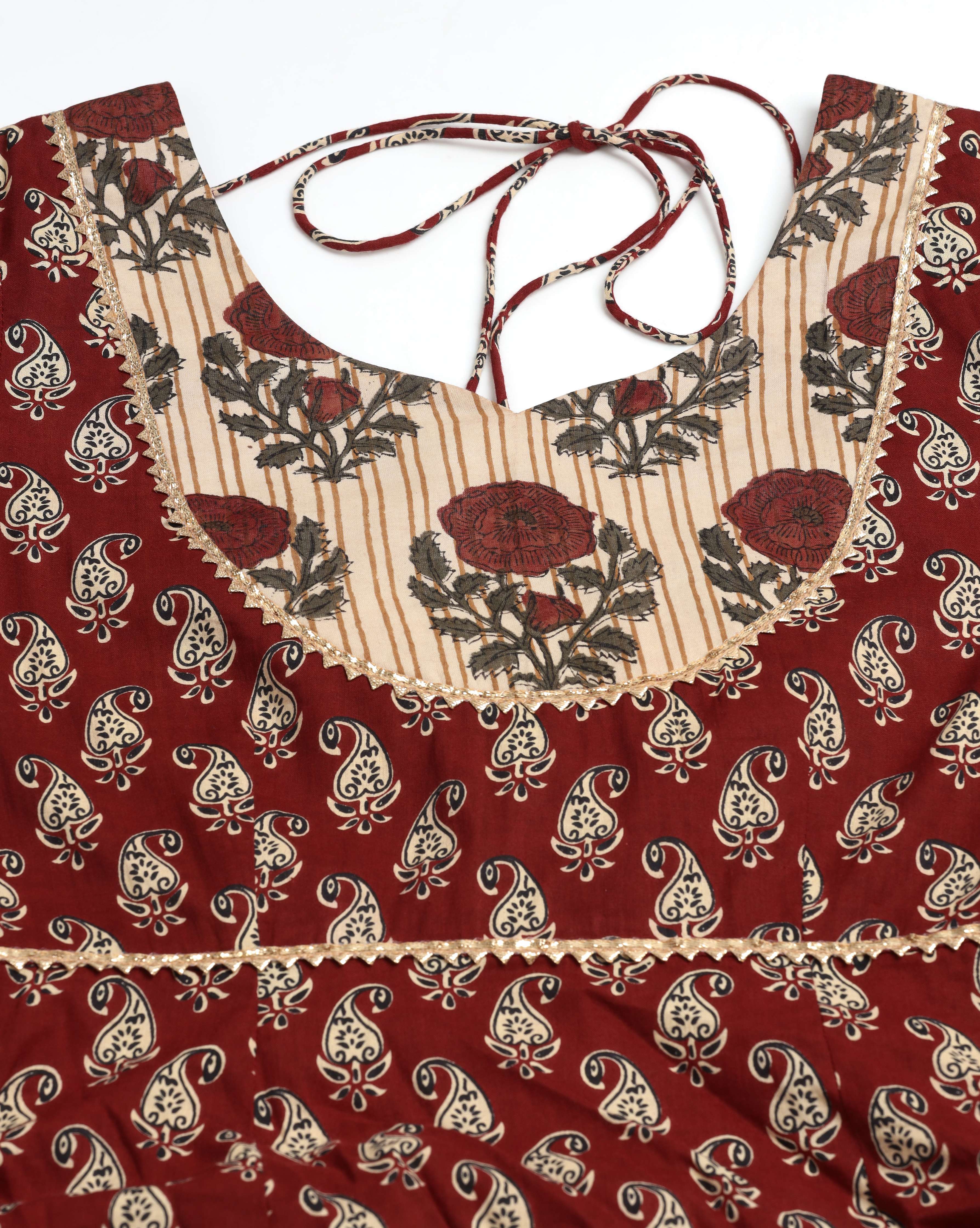 Elegant Design – Printed maroon kurta with lace accents for a festive look.