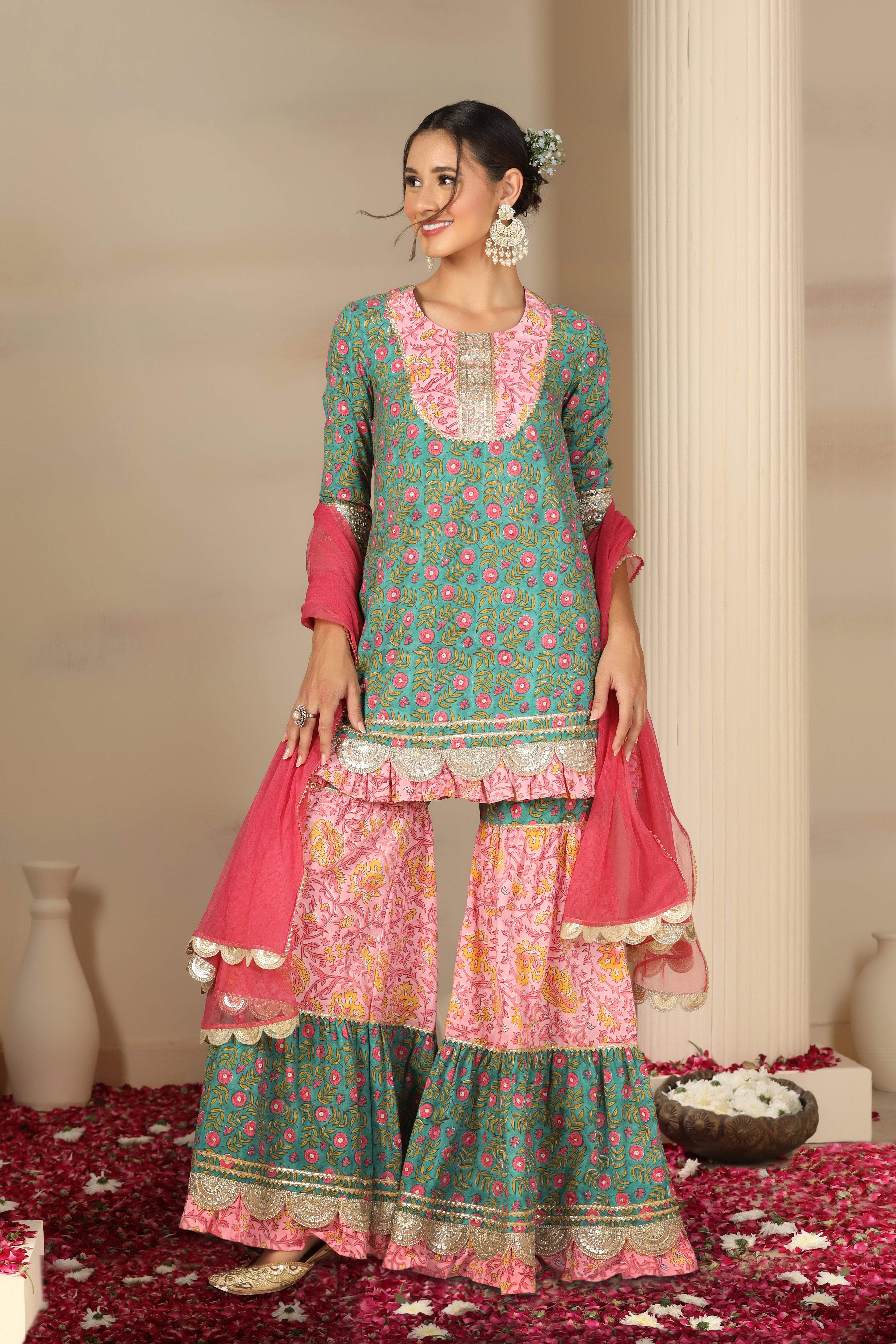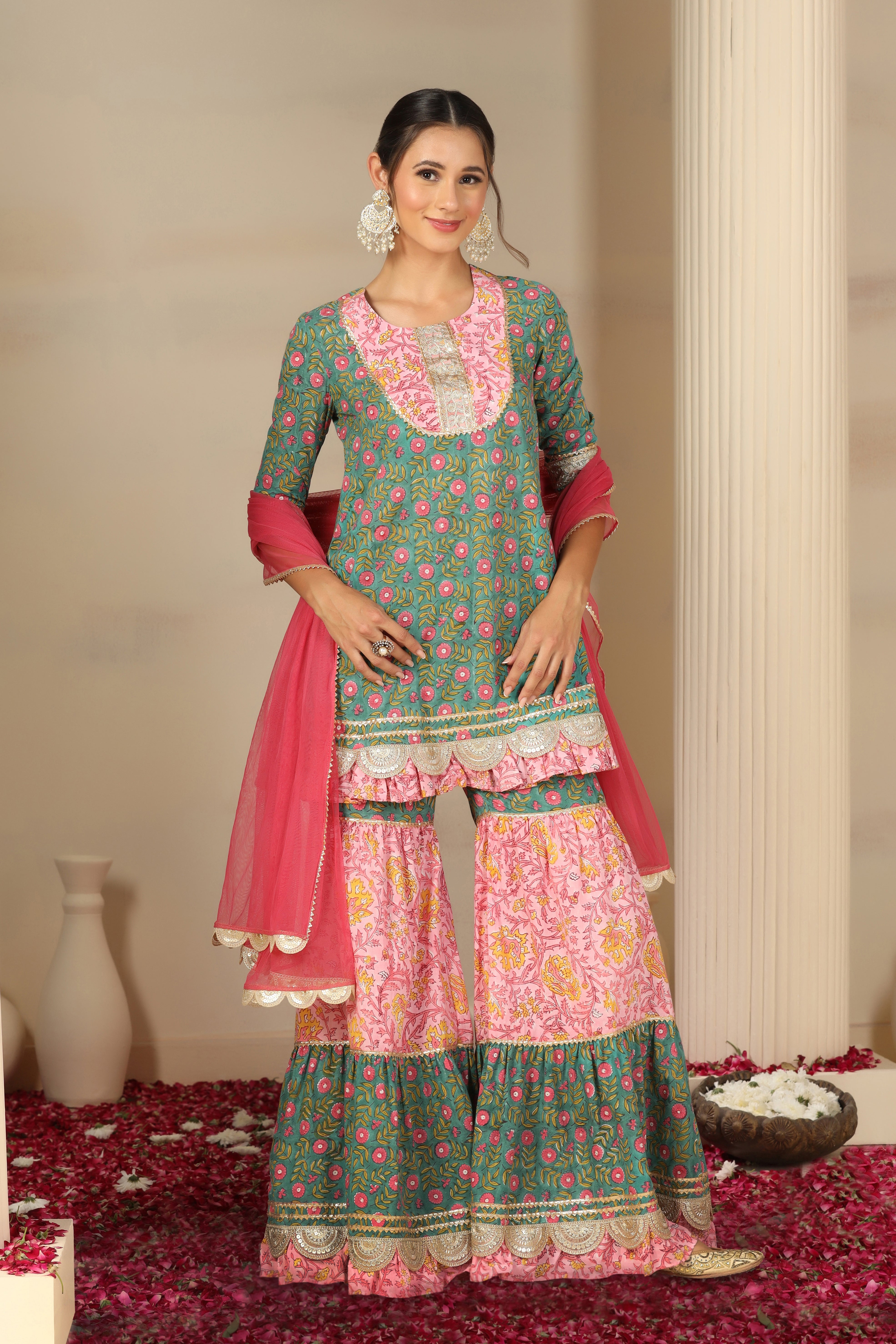 Step out in effortless elegance with this women’s cotton printed kurta set. Designed with a stylish A-line silhouette, it features a graceful neckline, 3/4th sleeves, and intricate prints that add charm to your look. Paired with comfortable pants and a coordinating dupatta, this outfit is perfect for casual outings, festive occasions, or office wear. Its breathable cotton fabric ensures comfort throughout the day, while the classic design brings a blend of tradition and modern style.